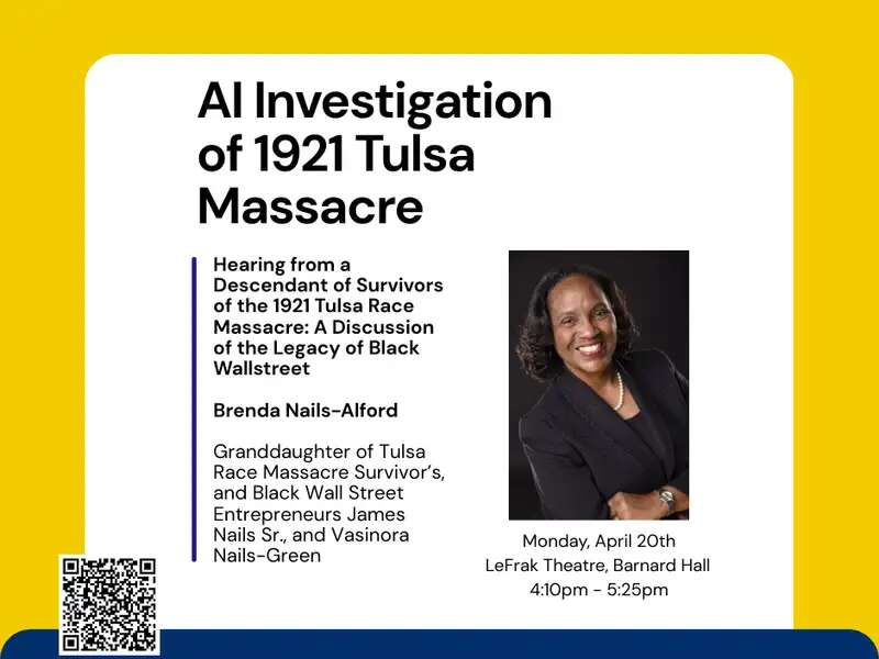 Apr 20 AI Investigation of 1921 Tulsa Massacre: Brenda Nails-Alford (Granddaughter of Tulsa Race Massacre Survivor’s, and Black Wall Street Entrepreneurs James Nails Sr., and Vasinora Nails-Green) April 20, 2026 | 4:10pm - 5:25pm LeFrak Theatre, Barnard Hall (3009 Broadway, New York, NY)