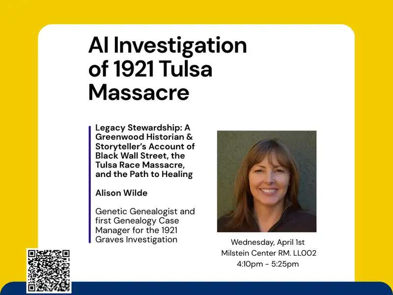 Apr 1 AI Investigation of 1921 Tulsa Massacre: Alison Wilde (Investigative Genetic Genealogist and first Genealogy Case Manager for the 1921 Graves Investigation) April 1, 2026 | 4:10pm - 5:25pm Milstein Center RM. LL002