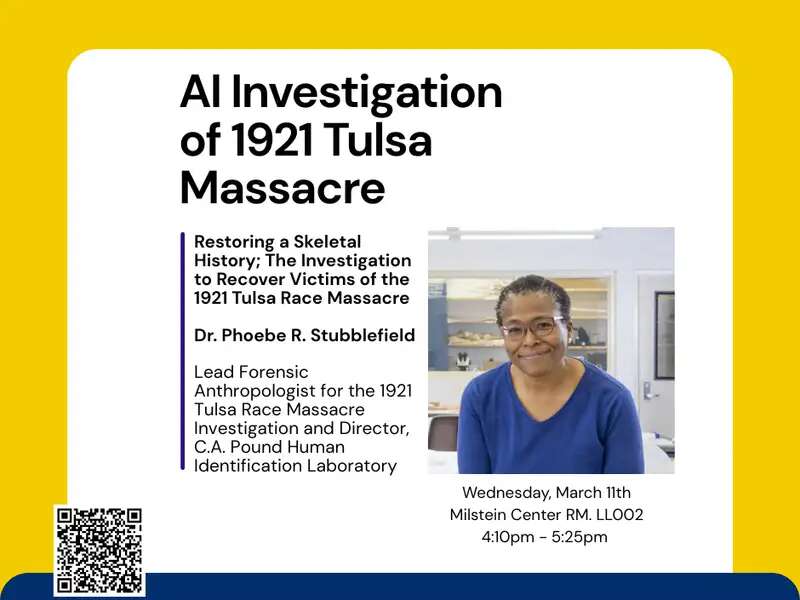 Mar 11 AI Investigation of 1921 Tulsa Massacre: Dr. Phoebe R. Stubblefield (C.A. Pound Human Identification Laboratory) March 11, 2026 | 4:10pm - 5:25pm Milstein Center RM. LL002