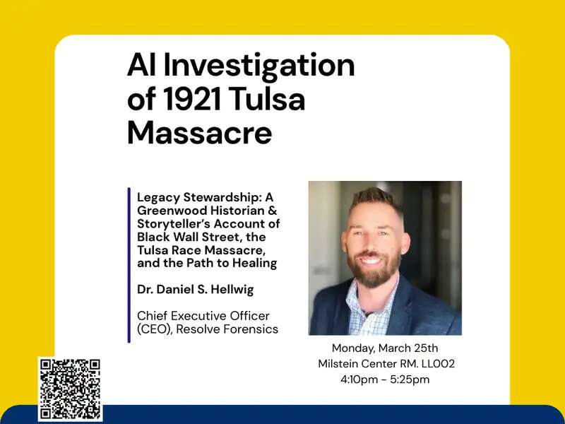 Mar 30 AI Investigation of 1921 Tulsa Massacre: Dr. Daniel S. Hellwig (Chief Executive Officer (CEO), Resolve Forensics) March 30, 2026 | 4:10pm - 5:25pm Milstein Center RM. LL002