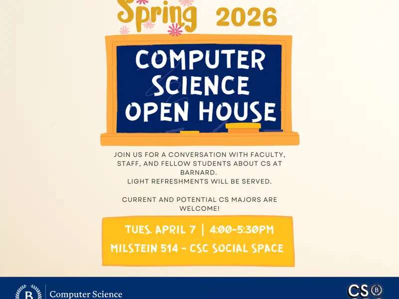 Apr 7 Computer Science Open House Spring 2026 April 7, 2026 | 4:00pm - 5:30pm Milstein 514 (CSC Social Space)