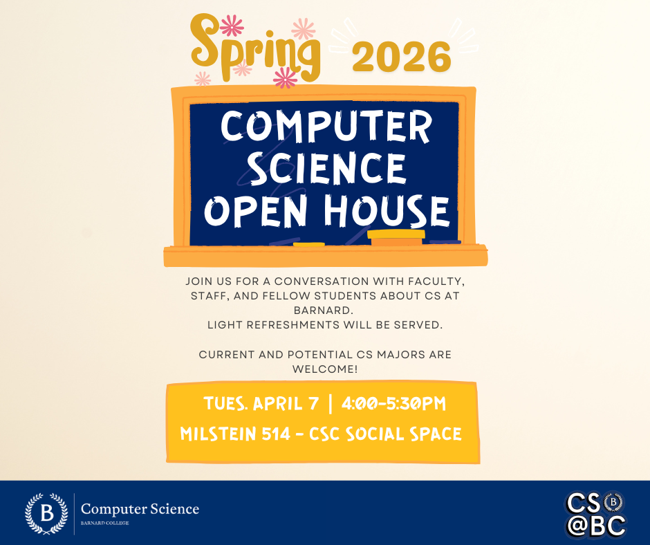 The Spring 2026 Computer Science Open House will be held on Tuesday, April 7. Join us for conversation with faculty, staff, and fellow students about Computer Science at Barnard.