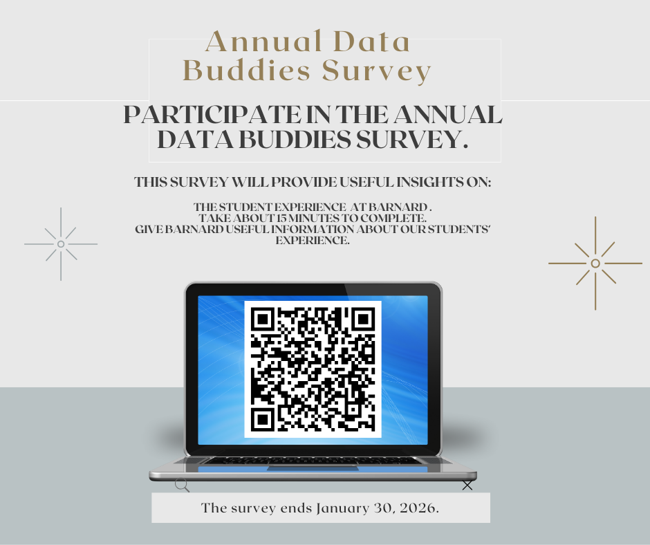 Barnard Computer Science is participating in the Computing Research Association's (CRA) Data Buddies project and we request your participation in the annual Data Buddies survey. This survey will provide useful insights into the student experience both at Barnard and nationally. We encourage you to complete their survey, which is expected to take about 15 minutes to complete. Your contribution to the Data Buddies project helps the academic Computer Science community to understand factors related to academic retention and persistence, as well as giving Barnard useful information about our students’ experience.